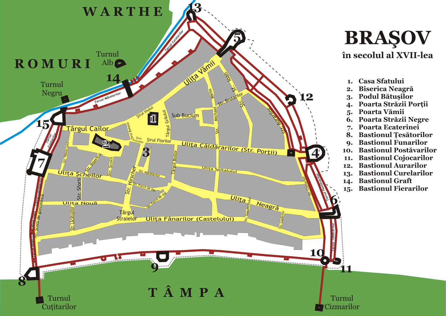 Harta fortificațiilor include și cele patru porți celebre ale orașului: Poarta Principală, Poarta Vămii, Poarta Străzii Negre și Poarta Ecaterinei. Fiecare dintre acestea are propria poveste, iar turiștii care doresc să le viziteze le pot găsi pe toate, cu excepția Porții Ecaterinei, în partea de est a Brașovului. Între acestea pot fi admirate și Basionul Aurarilor și cel al Cojocarilor. De partea cealaltă, în vestul orașului se află Bastionul Fierarilor și cel al Țesătorilor. Zona de nord este protejată de Bastionul Graft și de cel al Curelarilor, iar cea de sud cuprinde Bastionul Funarilor.